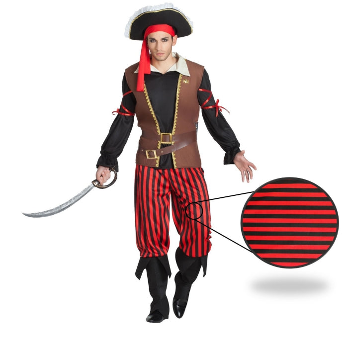 Continuando con sus características distintivas, esta tela destaca por su calidad y versatilidad. Su elasticidad permite un ajuste cómodo y mayor libertad de movimiento, mientras que su resistencia asegura que se mantenga en excelentes condiciones durante tus travesías. Las líneas rojas y negras añaden el toque auténtico y distintivo del disfraz de pirata.