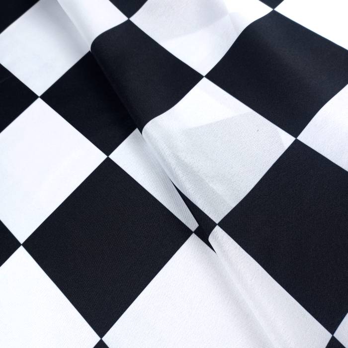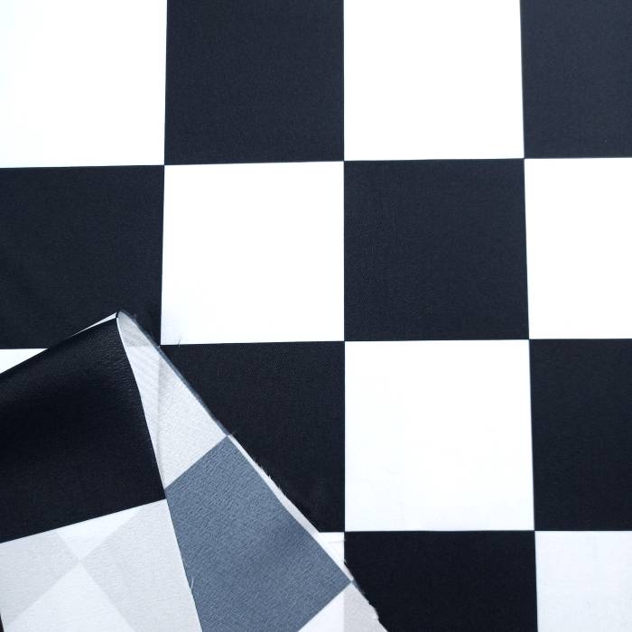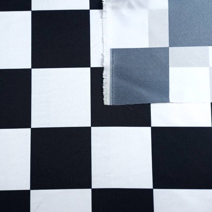 La tela Bandera de Carreras – por metros – es un textil liso y suave que presenta un diseño en cuadros blanco y negro, siendo rígida y liviana. Cada cuadro mide 10x10cm, perfecto para una variedad de proyectos creativos y funcionales.